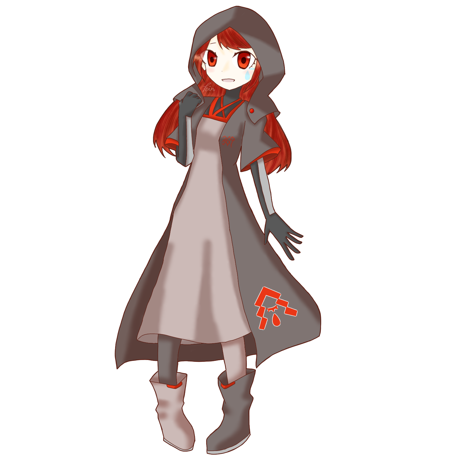 - 紅い髪に紅い瞳を宿した少女。オーバーサイズか、露出が少ない服を好む傾向がある。涙のマークのメイクが特徴的。