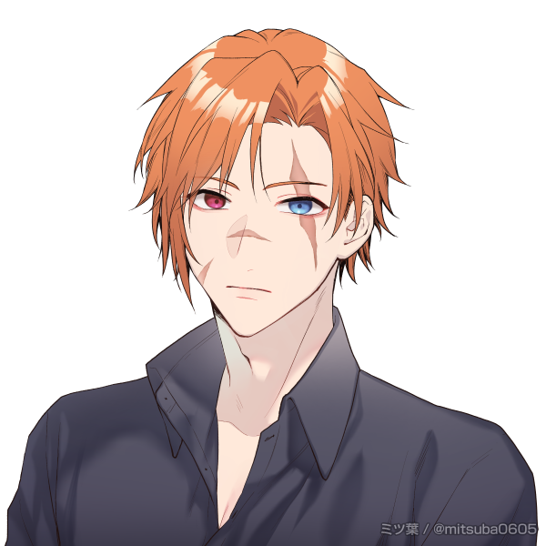 容姿:オレンジの髪、赤と青のオッドアイ、顔に傷。