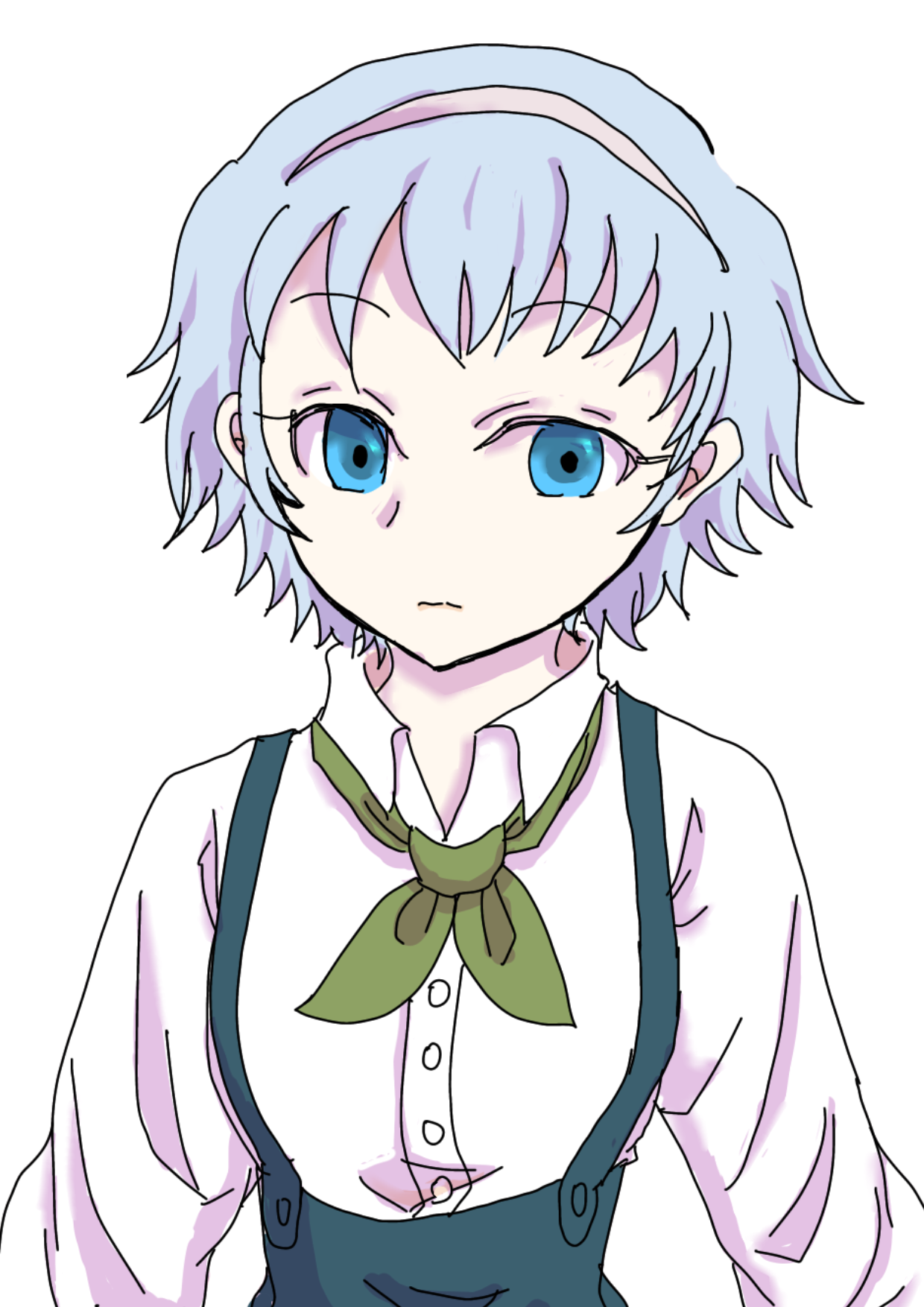 薄青色の短髪。カチューシャをつけている。(チープ・アクターにもらったもの)