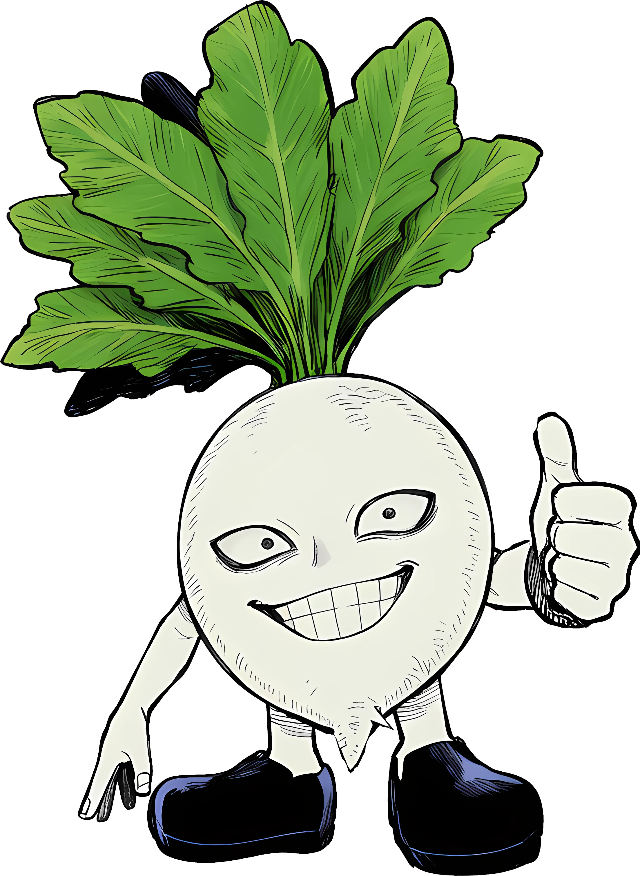 刀形態はどう見ても大根。葉っぱの部分が持ち手。人間形態は白色になった首領パッチに大根の葉っぱが生えたような見た目。