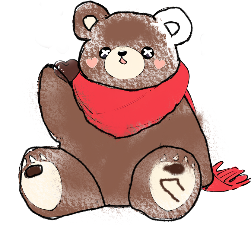 おおきな耳、ふわふわの体、そしてヒーローみたいな赤いマフラーを巻いたクマの絵が完成しました。