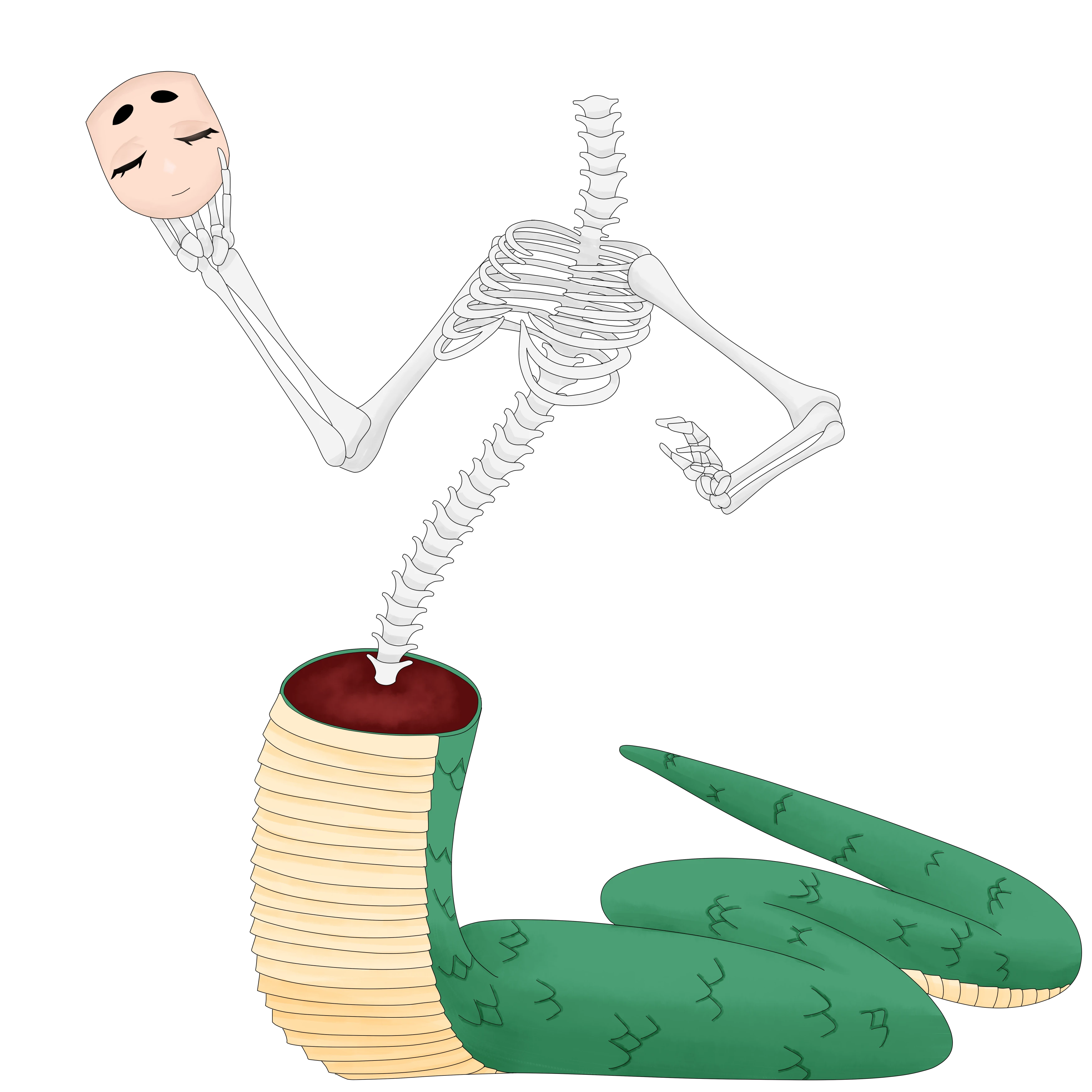 信仰が既に廃れているためほとんどの権能を失い、上半身も骨化しているが、別に良いかと思っている。