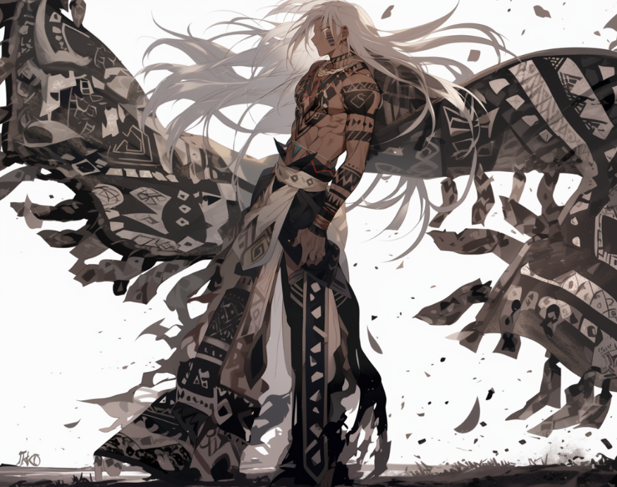先ず目を引くのはその褐色の肌の上に走る黒の紋様と長い白銀の頭髪。
