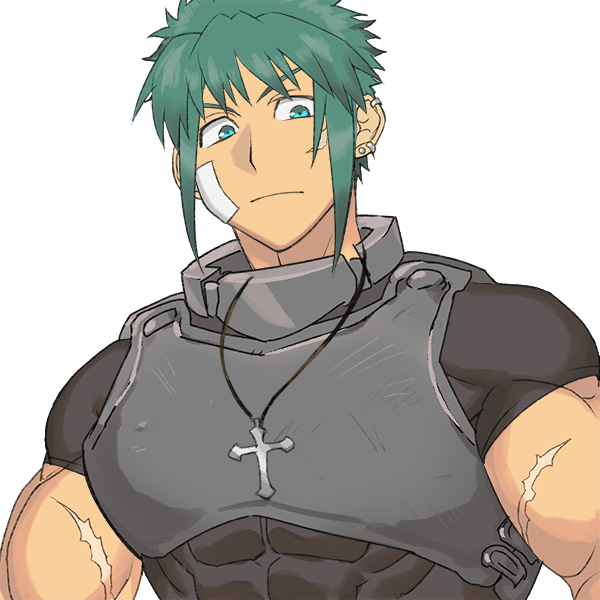 緑の髪に青の目を持つ青年。幼い頃、捨てられていたところを名のある傭兵団に拾われ、そこで育つ。成人後そのまま傭兵団に加入したが初陣で頭領リベット·グレンが戦死、そのまま傭兵団が離散してしまったため冒険者として出直すこととなった。