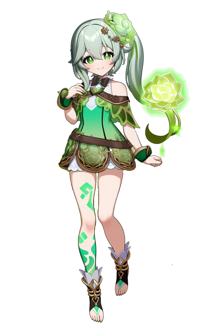 太陽の光を浴びると光る様に輝く黄緑色のポニーテールヘアーが特徴的な少女。