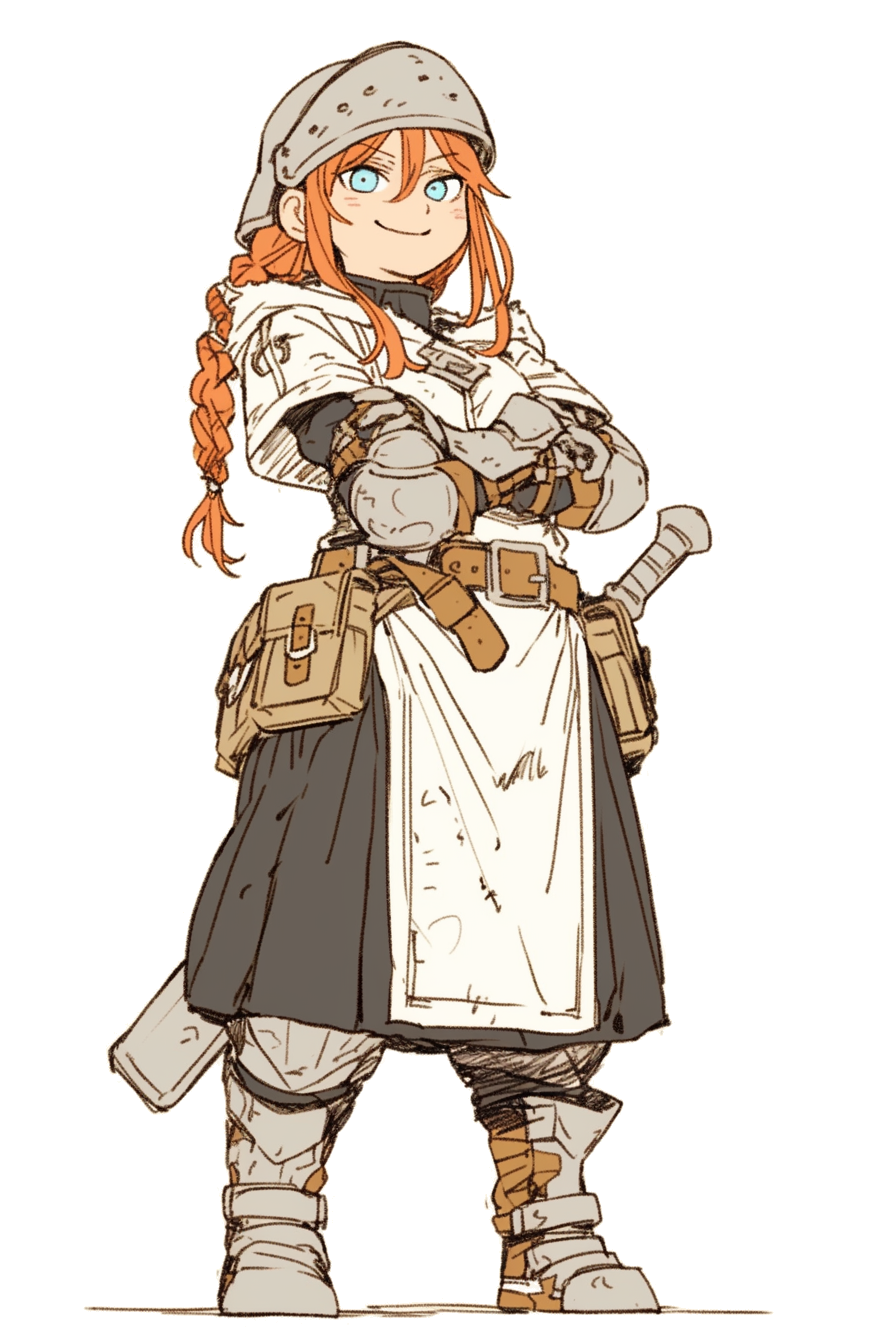 出身はディガット山脈、エイヴの丘陵地である。薄橙の肌、青い瞳、燃えるような赤い髪と編み込みは典型的なドワーフのそれだが、彼女の血の半分は人間のものでもある。
