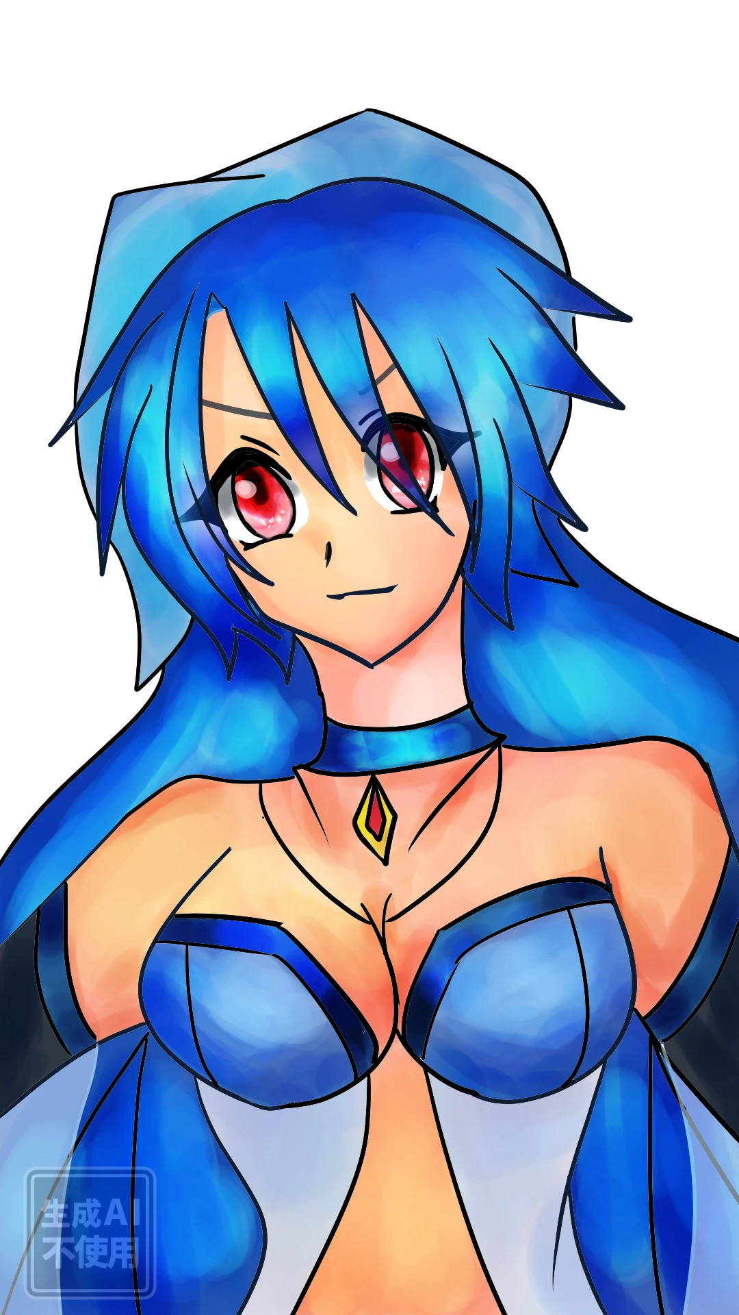 青い長い髪に小麦色の肌、そして赤い色をした瞳を持つ。