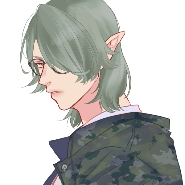 灰緑色系の髪にモカシン色系の瞳のエルフの男性