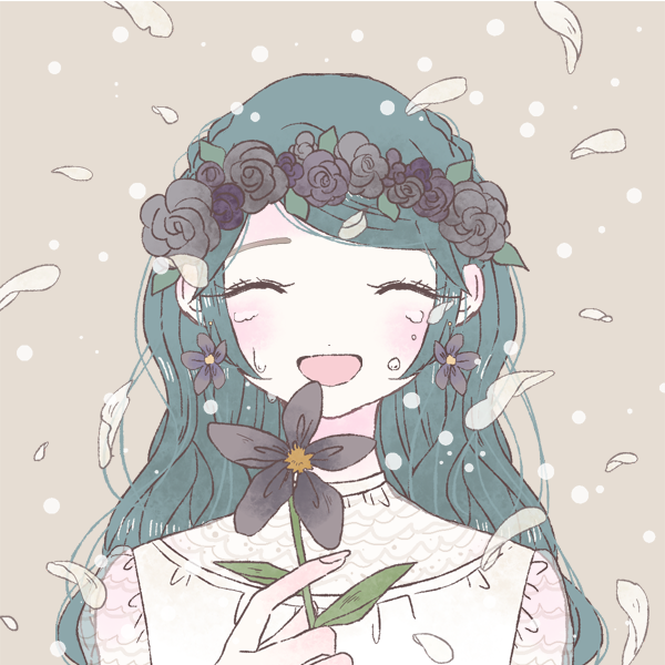 立ち絵とは違うが手にはくすんだ色のポインセチア(花言葉は幸運を祈る)が、頭には同色の薔薇が咲いている。ポインセチアは生まれつきこの色だったが頭の薔薇は生まれた頃は白色(花言葉は純潔)で、魔導死骸区に流れ着いて暫くしたら色が変化した。