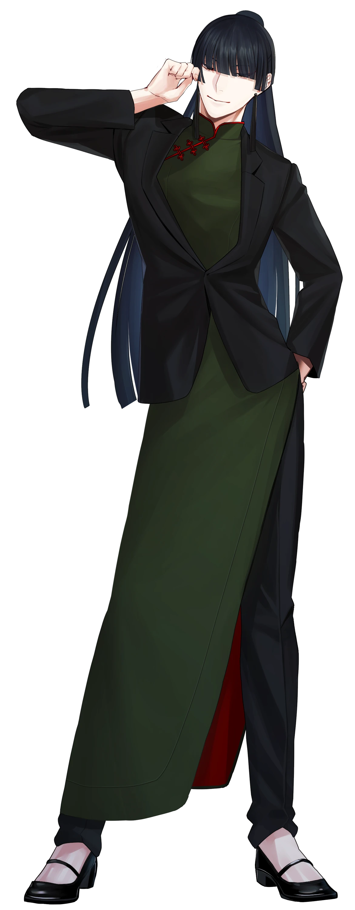 チャイナ服にスーツの上着を着ている