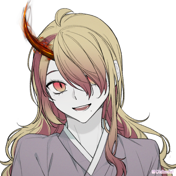 ……朱色と黄色が混ざった長髪、紅く燃えるような角、気さくな笑顔、長身。